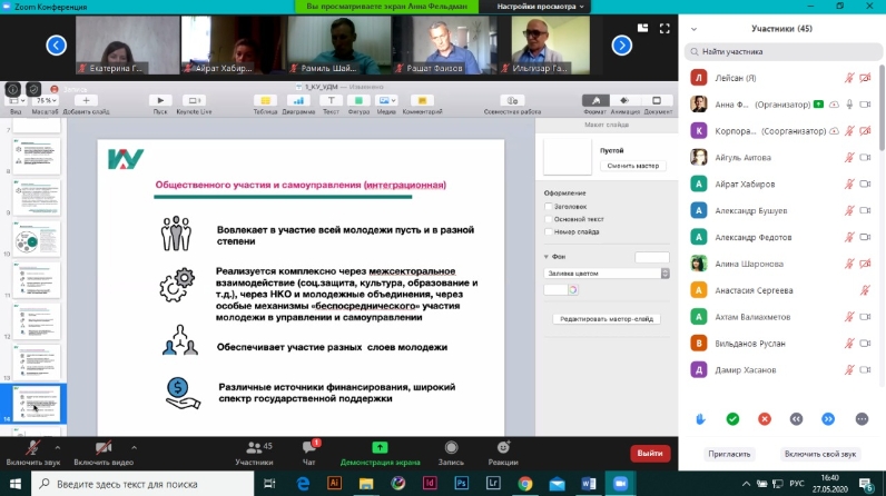 На онлайн-вебинаре присутствовали 45 руководителей органов по делам молодёжи муниципальных образований Республики Татарстан и их заместители.