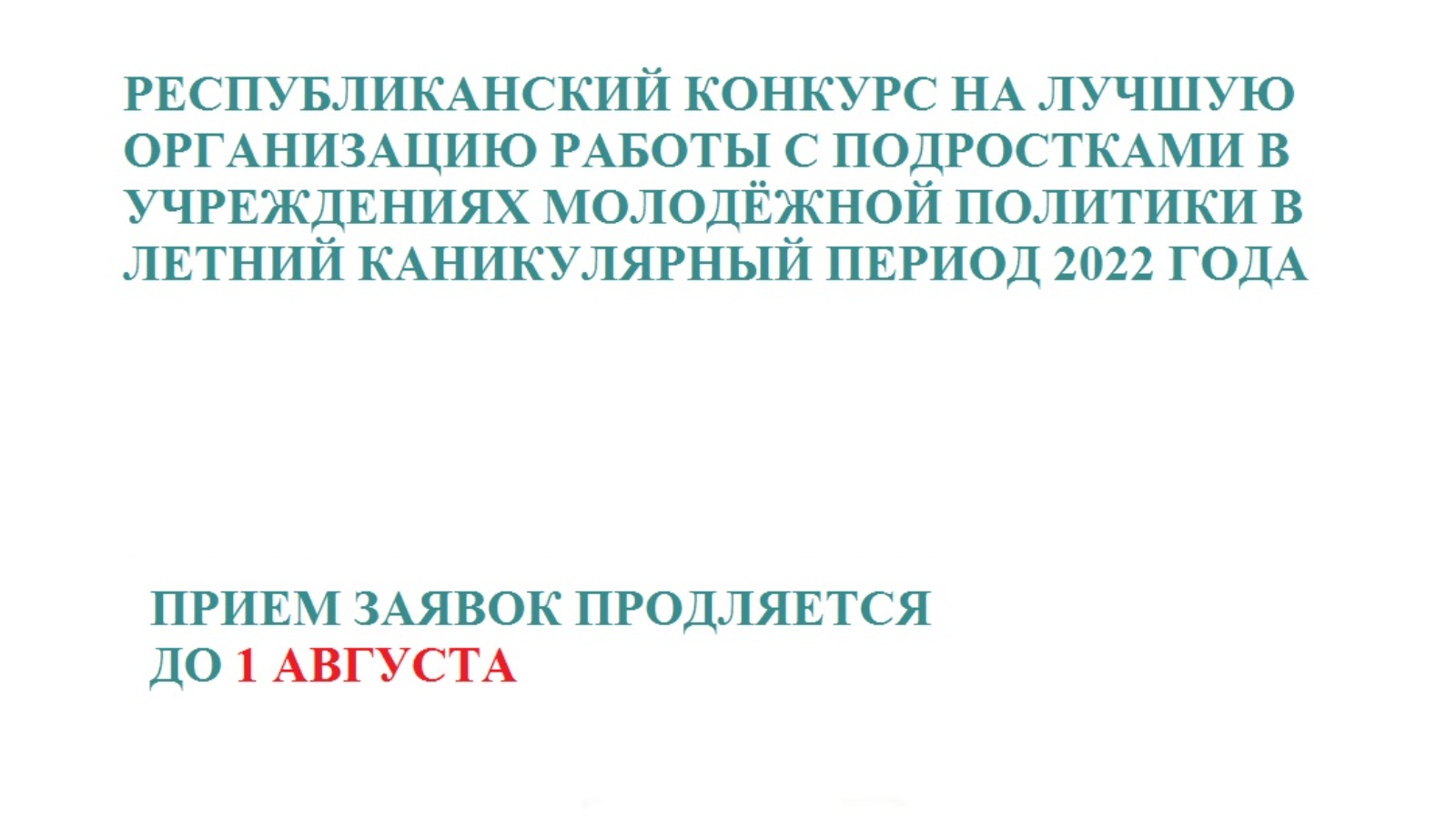 Прием заявочных материалов на Республиканский конкурс на лучшую организацию работы с подростками в учреждениях молодежной политики в летний каникулярный период 2022 года продляется до 1 августа 2022 года.