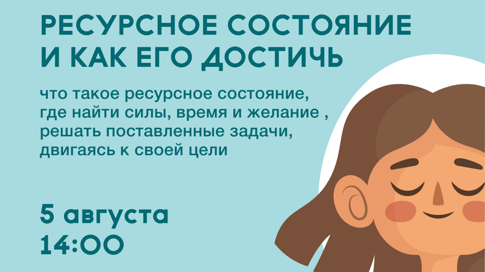 - 5 августа на вебинаре, посвященном теме «Ресурсное состояние и как его достичь», где затронем вопросы о том, что такое ресурсное состояние и где найти силы, время и желание, чтобы решать поставленные задачи. Вебинар проводит Фахрутдинова Аида Рафаилевна, педагог-психолог, победитель грантового конкурса для физических лиц Министерства по делам молодёжи РТ;