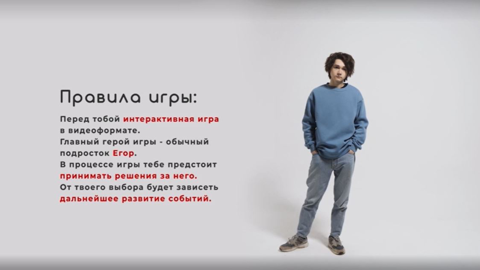 Пособие выполнено в формате интерактивной видеоигры, в которой молодой человек попадает в различные жизненные ситуации и должен сделать выбор, в зависимости от которого меняется сюжетная линия игры. Игра позволяет молодым людям прожить различный опыт, а также убедиться в том, как собственные поступки влияют и определяют дальнейшую жизнь человека.