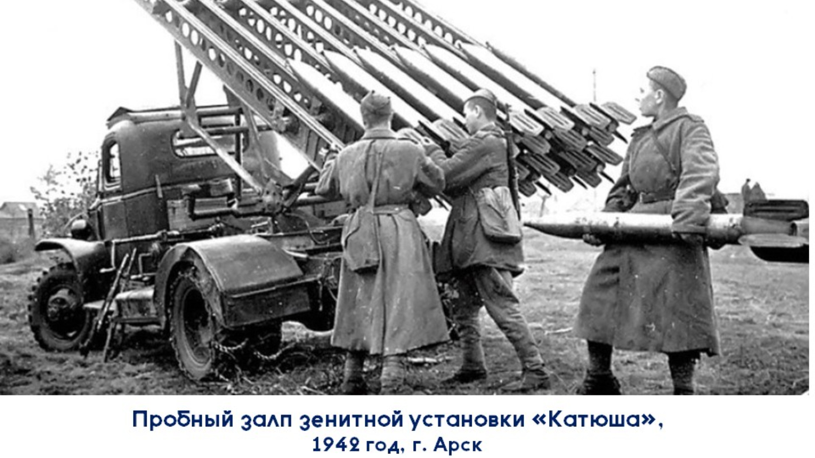 В начале декабря 1941 года был сформирован гвардейский полк в Арске, куда прибыли первые 60 выпускников ленинградского артиллерийского училища, там стали готовить специалистов по бою с «Катюшами». Перед новым 1942 годом под Арском показали пробный залп зенитной установки «Катюша». Результаты превзошли все ожидания. Все поставленные задачи были выполнены в срок. Большая часть военных кадров для реактивной артиллерии в 1942 году была подготовлена в Татарстане, в Арске.