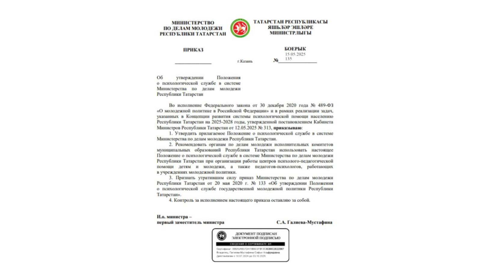 Данный шаг направлен на совершенствование системы психологической помощи и поддержку молодежи в Республике Татарстан.